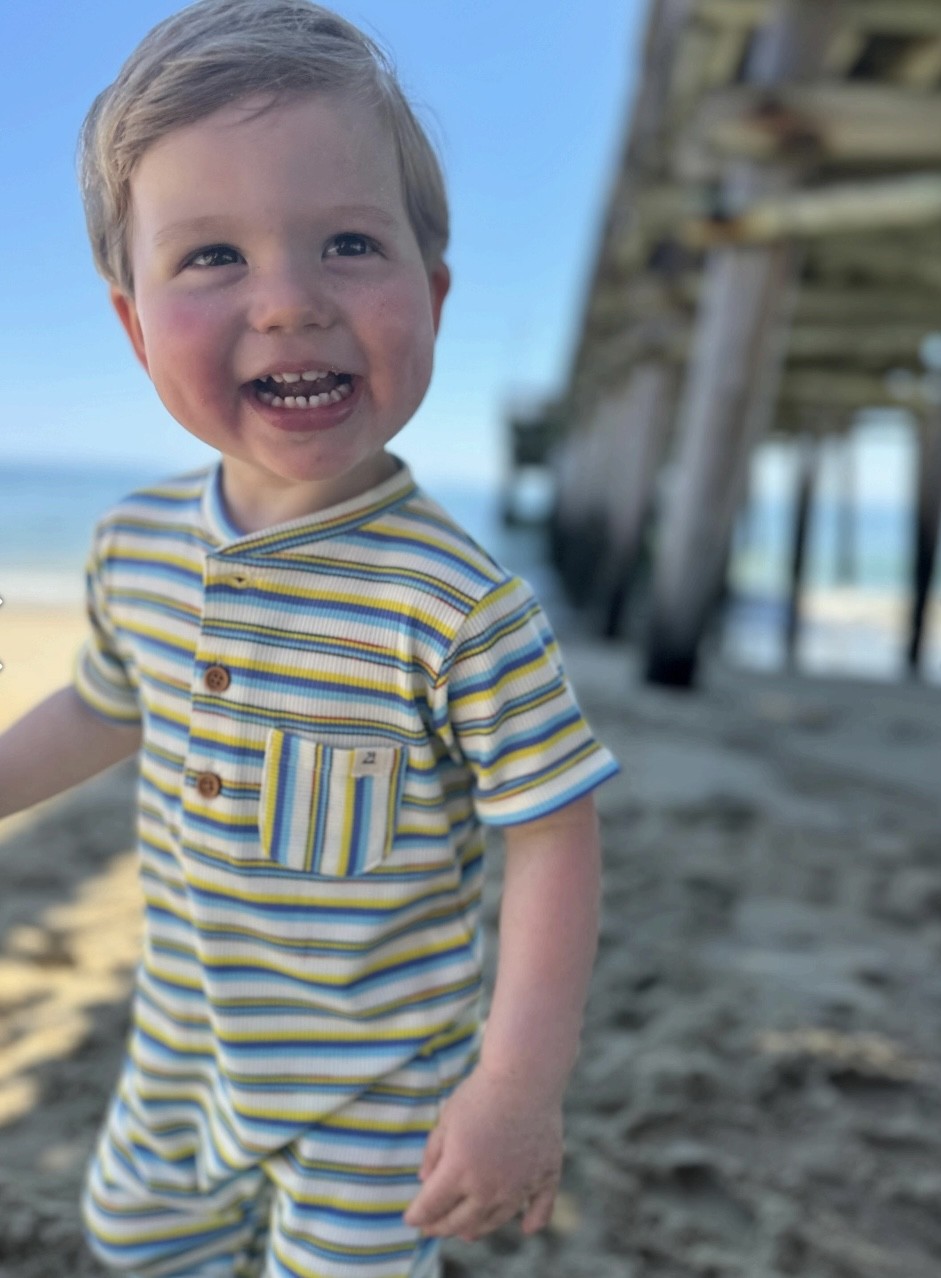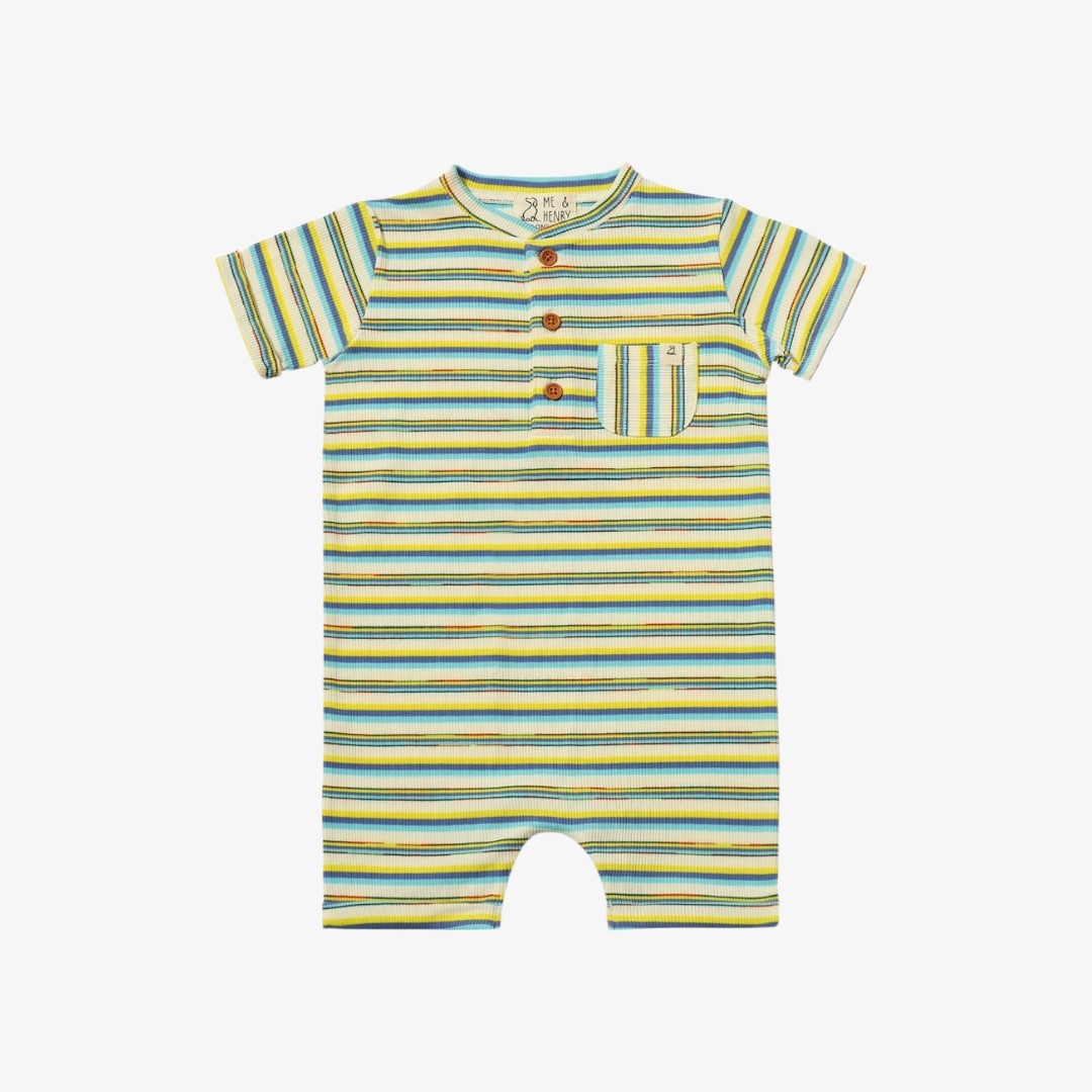 Las rayas de colores frescos de azul y amarillo en nuestro mono de jersey acanalado súper suave son llamativas! con 3 botones delanteros y detalles de bolsillo de parche en la parte delantera. La tela súper suave hará que sea cómodo de usar durante todo el día.
